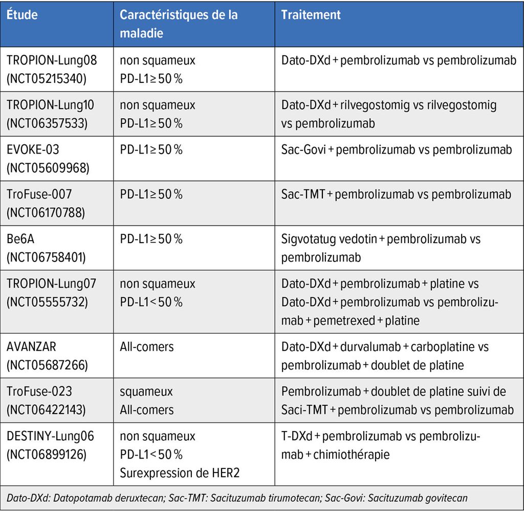 Plusieurs études de phaseI/II ont testé des combinaisons de première ligne associant ADC et chimiothérapie, immunothérapie ou les deux approches (TROPION-Lung02, TROPION-Lung04 avec Dato-DXd; EVOKE-02 avec Saci-Govitecan). Les doublets comme les triplets ont montré une activité antitumorale soutenue, mais également des taux substantiels d’effets indésirables.10 Actuellement, de nombreuses études de phaseIII évaluent des combinaisons d’ADC + inhibiteurs de points de contrôle immunitaire en première ligne dans le NSCLC métastatique avec une expression élevée de PD-L1 (≥50%), PD-L1<50% ou all-comers (Tab.1).