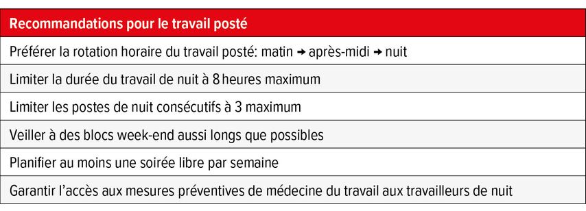 Lors de la consultation, il convient d’attirer l’attention sur le fait qu’il n’existe aucune accoutumance physique complète au travail posté et que certains troubles, notamment du sommeil, ne sont donc pas inhabituels. Il est important de se sentir reposé pendant les périodes de repos; si ce repos n’est pas garanti, un «syndrome du travailleur posté» peut survenir. Après un poste de nuit, il ne faut pas regarder ni informations ni films excitants et il convient de se rendre rapidement dans une salle de repos à l’abri du bruit pour dormir, éventuellement après un repas léger. L’exposition à la lumière du jour doit être évitée à l’aide de rideaux opaques. Une deuxième phase de sommeil l’après-midi est appréciée par de nombreuses personnes concernées.