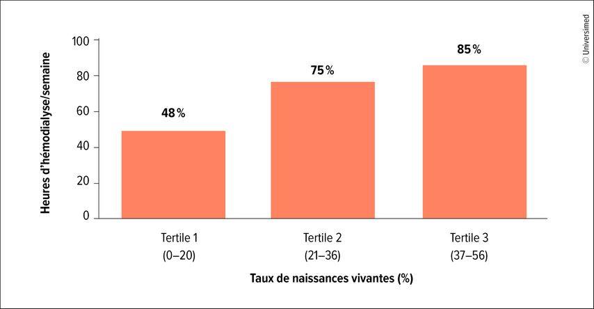 Fig.1: Taux de naissances vivantes selon l’intensité de la dialyse: il existe une relation dose-dépendante significative entre l’intensité de l’hémodialyse et le taux de naissances vivantes. Celui-ci passe de 48% pour les femmes sous hémodialyse pendant ≤20 heures par semaine à 75% pour celles sous hémodialyse pendant 21 à 36 heures par semaine et à 85% pour celles sous hémodialyse pendant ≥37 heures par semaine (modifiée selon Hladunewich MA et al. 2014)3