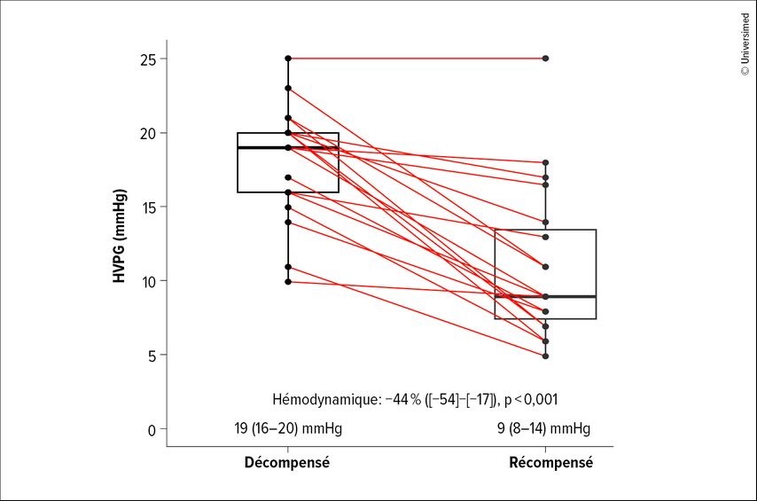 Fig.1: Améliorations du gradient de pression veineuse hépatique (HVPG) après la recompensation par rapport aux mesures antérieures à un stade décompensé