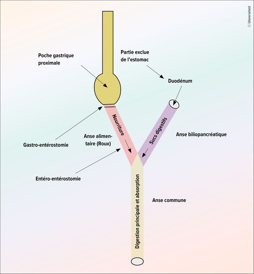 Il s’est avéré qu’ils avaient tous été traités pour une obésité sévère par un «distal very long Roux-en-Y gastric bypass» (DVLRYGB) à effet malabsorptif, une variante du bypass gastrique qui ne peut plus être recommandée aujourd’hui, selon R.Peterli. Dans une étude rétrospective menée en Suisse chez 355 patients présentant une très longue anse alimentaire (Roux) de 604±99cm, une anse commune de 76±7cm et une anse biliopancréatique de 79± 14cm (Fig.1), une réduction du surpoids >74% a pu être obtenue avec une incidence relativement faible d’effets indésirables tels que des carences nutritionnelles, etc., au cours de la période de suivi de 5 ans.5 Comme le montrent les complications à long terme mentionnées, cette variante du bypass gastrique est cependant très dangereuse. «On pense que la longue anse alimentaire et la très courte anse commune ont un effet toxique sur le foie», a expliqué R. Peterli.6 Cette chirurgie n’est plus listée parmi les interventions de référence dans les directives de la SMOB (www.smob.ch).7