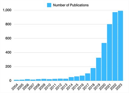 Fig. 2: Nombre de publications par an au cours des 20 dernières années incluant les termes «intelligence artificielle» et «cardiologie»