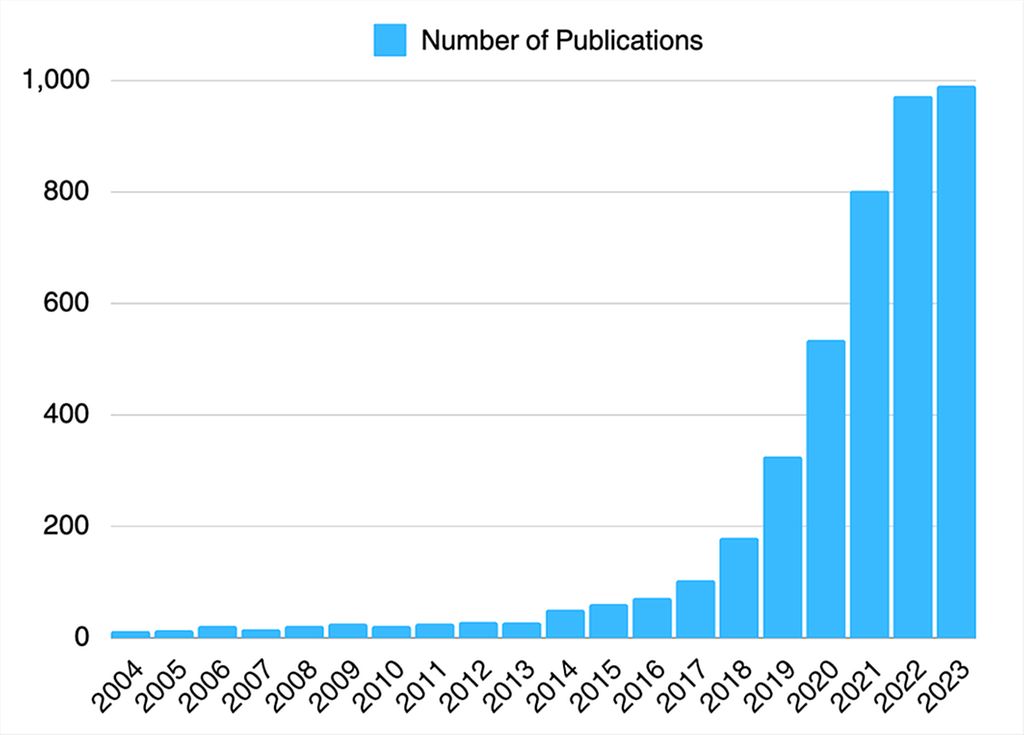 Dans la cardiologie moderne, l’IA révolutionne la détection précoce des maladies CV en analysant de manière approfondie les données des patients, y compris les antécédents médicaux, les prédispositions génétiques et les modes de vie. Cela permet de prédire le risque de maladie cardiaque en analysant les habitudes de vie, les choix alimentaires et les schémas d’exercice, facilitant ainsi les mesures préventives et la création de plans de traitement personnalisés. Cette approche de médecine personnalisée permettrait de sortir du paradigme «one-size-fits-all» qui conduit souvent à de la surmédicalisation ou de la sous-médicalisation.4 La communauté scientifique en cardiologie a également manifesté un intérêt considérable pour ce domaine, comme en témoigne l’analyse de la base de données PubMed et de la liste des publications des vingt dernières années incluant les termes «cardiology» et «artificial intelligence». La tendance dévoile une augmentation impressionnante du nombre de publications annuelles intégrant ces termes spécifiques (Fig. 2).