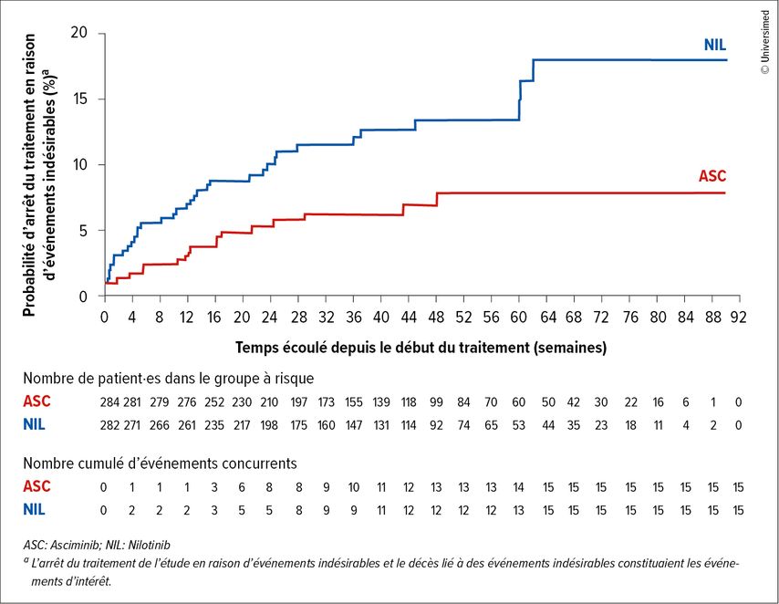 Fig.1: Délai avant l’arrêt du traitement en raison d’événements indésirables sous asciminib comparé au nilotinib dans la leucémie myéloïde chronique à chromosome Philadelphie positif nouvellement diagnostiquée et en phase chronique, dans l’étude ASC4START (modifiée selon Hochhaus A et al.)3