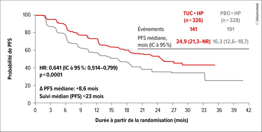 Après un suivi médian d’environ 23 mois, la PSF médiane était de 24,9 mois dans le bras tucatinib versus 16,3 mois dans le bras placebo (Fig.1). Le risque de progression de la maladie était réduit de 36% (HR: 0,64; IC à 95%: 0,51–0,80; p<0,0001). Le bénéfice en PFS avec le tucatinib a été observé dans tous les sous-groupes préspécifiés. La survie globale (OS) a montré un avantage numérique, avec un hazard ratio (HR) de 0,54 et un intervalle de confiance à 95% (IC à 95%) de 0,30–0,96 (p=0,0320). La médiane d’OS n’était pas encore atteinte dans les deux bras de l’étude, avec 18 versus 33 événements. Une analyse exploratoire a montré que les patient·es présentant des métastases cérébrales à l’inclusion obtenaient une PFS médiane presque doublée sous tucatinib par rapport au placebo (PFS médiane: 8,5 vs 4,3; HR: 0,72; IC 95% 0,406–1,273). Le profil de sécurité était gérable, avec des taux plus élevés de diarrhée, de nausées et d'élévation des paramètres hépatiques dans le bras expérimental par rapport au bras contrôle.