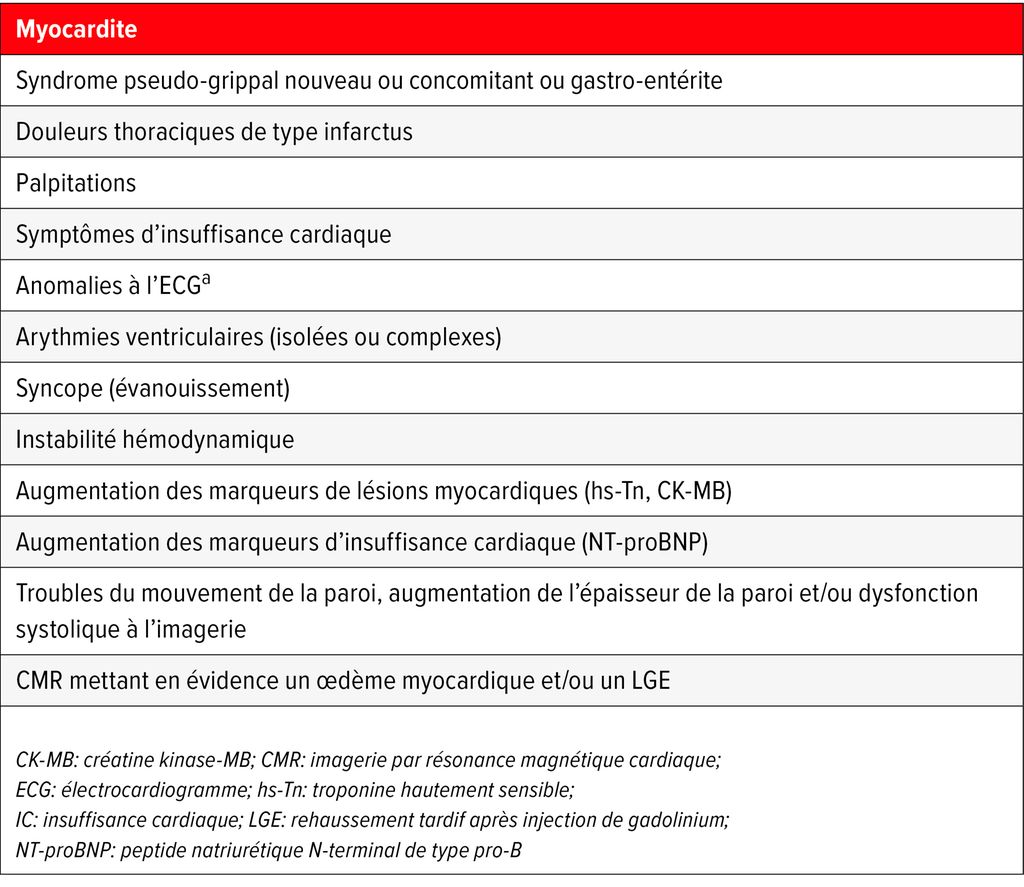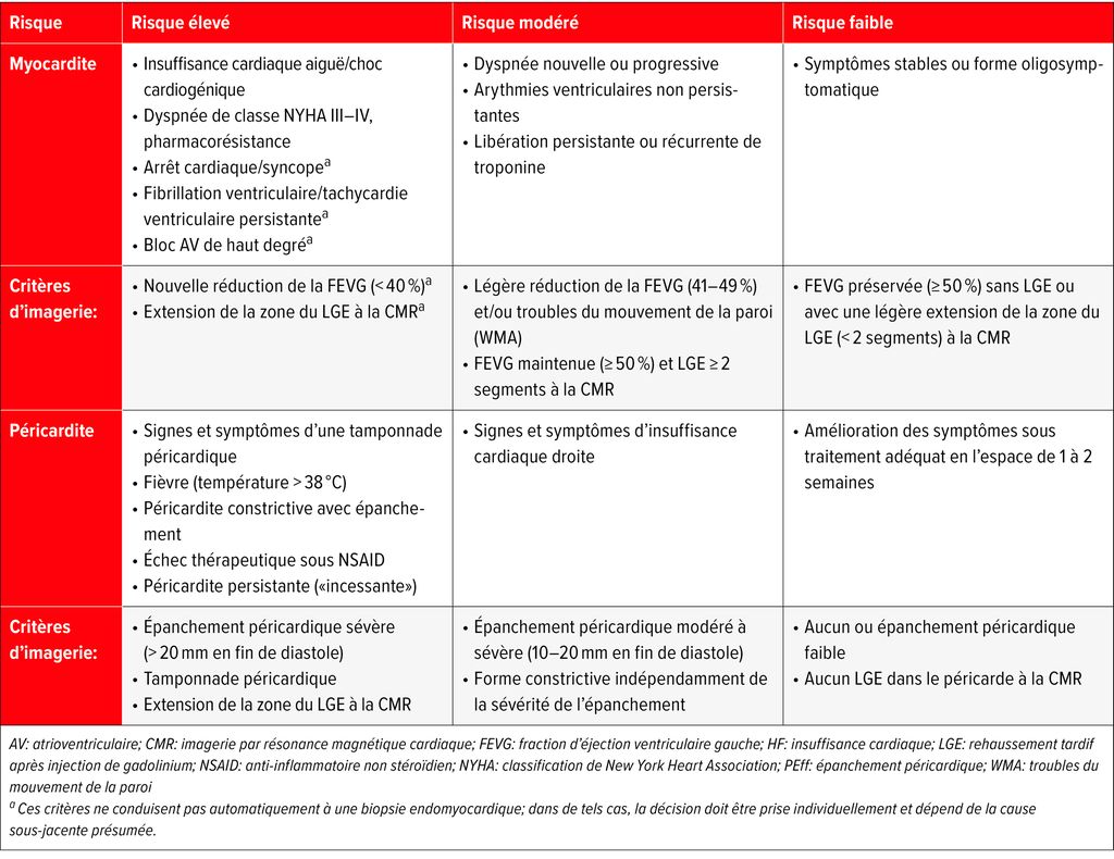 Quels sont les signes ou symptômes qui indiquent une myocardite ou un «inflammatory myopericardial syndrome» (IMPS) (Tab.1 et 2)? Comment gérer les symptômes d’insuffisance cardiaque ou les arythmies? Les directives proposent également des diagrammes de flux et des algorithmes complets pour ces questions.