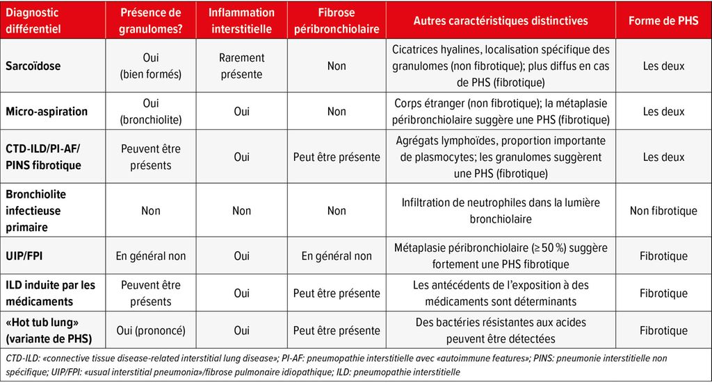 La pneumopathie d’hypersensibilité (PHS) est une pneumopathie interstitielle à médiation immunitaire qui est causée par des réactions immunitaires à des antigènes inhalés. Le diagnostic repose sur l’anamnèse, l’examen clinique, la radiologie, le lavage bronchoalvéolaire et, si nécessaire, une biopsie pulmonaire. Une caractéristique histologique centrale est la présence de granulomes non nécrosants. Toutefois, d’autres modifications pathologiques du parenchyme pulmonaire peuvent également suggérer une PHS, ce qui soulève la question suivante: combien de fois ne sont-elles pas détectées?