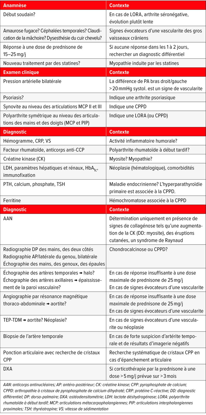 Enfin, la PMR constitue un diagnostic d’exclusion. Sur la base du diagnostic de travail de «syndrome polymyalgique», il convient de rechercher les diagnostics différentiels principaux avant de poser un diagnostic définitif.