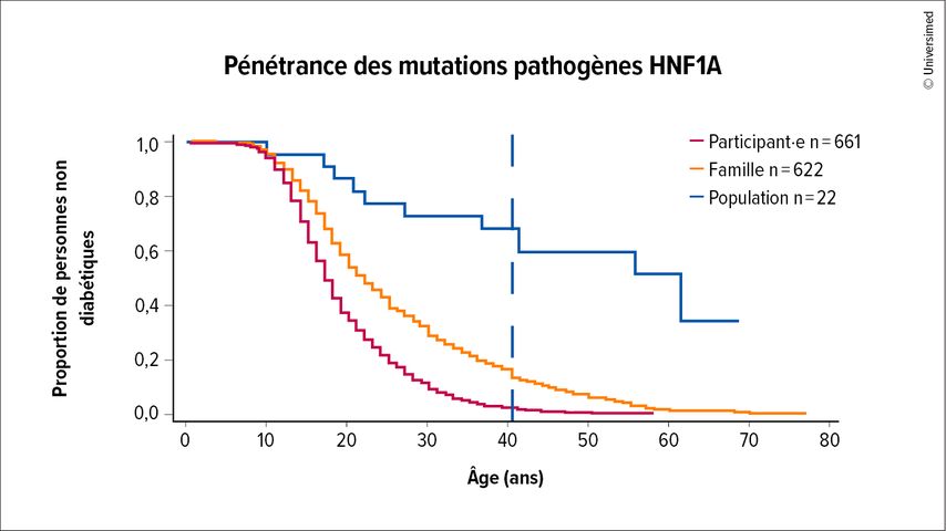 Fig.1: Pénétrance des mutations pathogènes HNF1A dans différentes cohortes. La figure représente la proportion de personnes non diabétiques en fonction de l’âge. Les personnes index (rouge) et les parents présentant des mutations HNF1A (orange) ont une probabilité plus élevée de développer la maladie que la population globale (bleu), ce qui indique des facteurs génétiques et environnementaux influençant la manifestation (selon Mirshahi UL et al. 2022)5