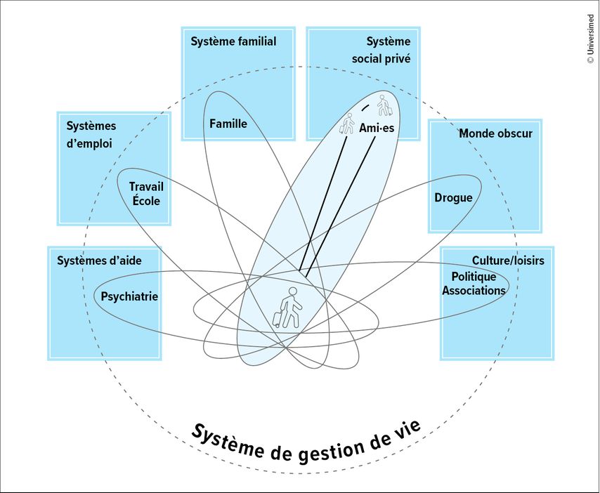 La théorie «Intégration et gestion de vie»2,3 développée par Sommerfeld et al. peut servir ici de cadre de référence: elle décrit le système de gestion de vie d’une personne comme l’interface où les conditions sociales sous forme de systèmes d’action rencontrent les ressources et les défis individuels et où l’individu, en tant qu’acteur, gère sa propre vie dans les conditions données. C’est aussi l’interface où la santé et la maladie sont négociées. À l’échelle de l’individu, la santé relative (c’est-à-dire la capacité à gérer sa vie avec succès dans des conditions de maladie) résulte en effet de l’interaction dynamique entre les systèmes sociaux existants (famille, travail, amis, etc.) et les stratégies, les schémas de gestion de vie de l’individu ainsi que ses ressources.1