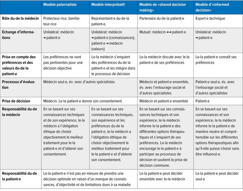 Le processus de SDM se trouve donc à la croisée des chemins entre le modèle paternaliste qui prévalait autrefois, dans lequel les médecins décidaient seul·es, et le modèle informatif, dans lequel les patient·es prenaient seul·es la décision et les médecins se contentaient de l’approuver. Outre le modèle paternaliste, le SDM et le modèle informatif, il existe également le modèle interprétatif. Dans ce cas, les préférences des patient·es sont certes demandées, mais la décision thérapeutique est prise unilatéralement par le·la médecin, comme dans le modèle paternaliste. Les quatre modèles sont présentés dans le Tableau 1 dans le contexte clinique.