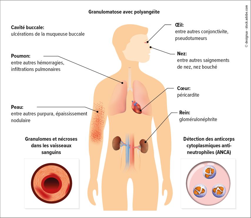 Fig. 1: La vascularite associée aux ANCA est une maladie systémique qui peut provoquer différents symptômes