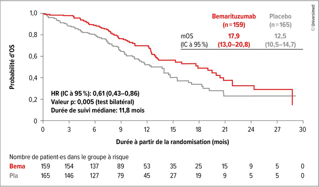 Fig.1: Survie globale (OS) de patient·es atteint·es d’un adénocarcinome non résécable ou métastatique de l’estomac ou du GEJ sous bemarituzumab+mFOLFOX6 versus placebo+mFOLFOX6 en cas d’expression de FGFR2b sur ≥10% des cellules tumorales (modifiée selon Rha SY et al.)2