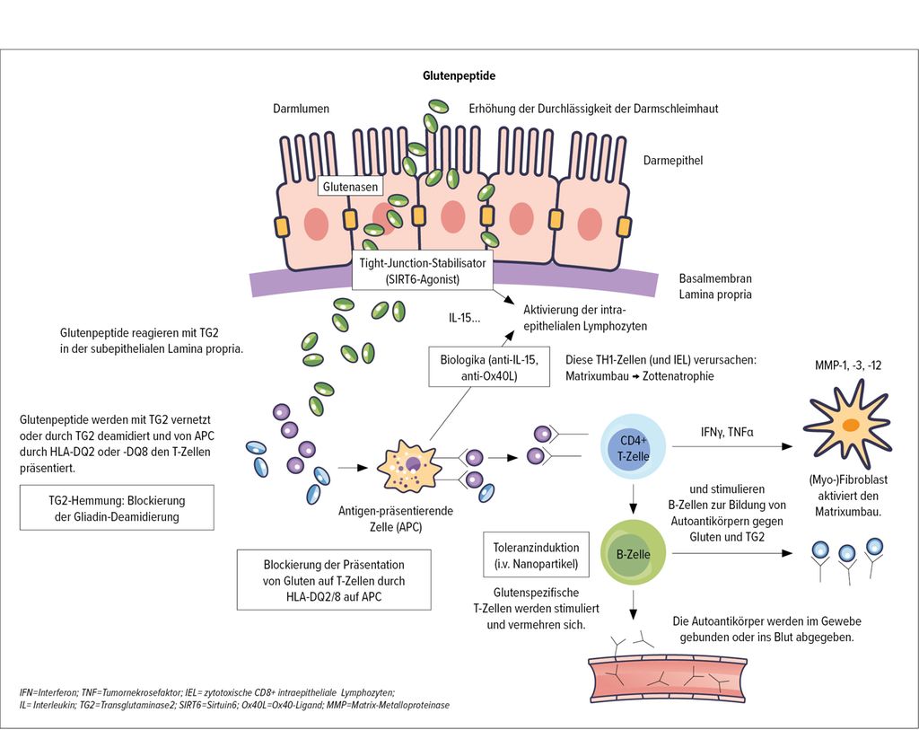 Viele Patienten mit Zöliakie haben trotz glutenfreier Diät weiterhin Beschwerden. Zurzeit befinden sich einige innovative therapeutische Ansätze in Entwicklung: u.a. ein Inhibitor der intestinalen Transglutaminase 2, Antikörper gegen Interleukin 15 und den Ox40-Liganden, ein Sirtuin-6-Agonist zur Verbesserung der intestinalen Barriere sowie Wirkstoffe zur Induktion einer Glutentoleranz.