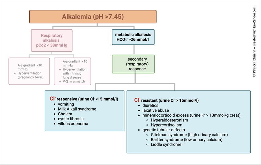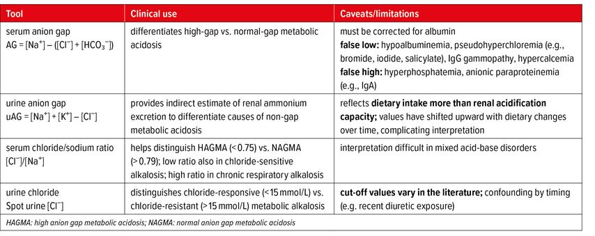 1 Adrogué HJ et al.: Clinical approach to assessing acid-base status: physiological vs Stewart. Adv Chronic Kidney Dis 2022; 29: 343-54 2 Planelles G: Chloride transport in the renal proximal tubule. Pflügers Arch 2004; 448: 561-70 3 Soleimani M: The multiple roles of pendrin in the kidney. Nephrol Dial Transplant 2015; 30: 1257-66 4Do C et al.: Metabolic Alkalosis pathogenesis, diagnosis, and treatment: core curriculum 2022. Am J Kidney Dis 2022; 80: 536-51 5 Rein JL, Coca SG: “I don’t get no respect”: the role of chloride in acute kidney injury. Am J Physiol Renal 2019; 316: 587-605 6 Ingelfinger JR et al.: Physiological approach to assessment of acid–base disturbances. N Engl J Med 2014; 371: 1434-45 7 Kamel KS, Halperin ML: Acid–base problems in diabetic ketoacidosis. N Engl J Med 2015; 372: 546-54 8 Palmer BF et al.: Renal tubular acidosis and management strategies: a narrative review. Adv Ther 2021; 38: 949-68 9 Palmer BF, Clegg DJ: Metabolic alkalosis treatment standard. Nephrol Dial Transplant 2024; 39: 1985-92 10 Trullàs JC et al.: The significance of metabolic alkalosis on acute decompensated heart failure: the ALCALOTIC study. Clin Res Cardiol 2024; 113: 1251-62 11 Testani JM et al.: Hypochloraemia is strongly and independently associated with mortality in patients with chronic heart failure. Eur J Hear Fail 2016; 18: 660-8 12 Ter Maaten JM et al.: Hypochloremia, diuretic resistance, and outcome in patients with acute heart failure. Circ Hear Fail 2018; 9: 003109 13 Libório AB et al.: Increased serum bicarbonate in critically ill patients: a retrospective analysis. Intensiv Care Med 2015; 41: 479-86 14 Uribarri J, Oh MS: The urine anion gap: common misconceptions. J Am Soc Nephrol 2021; 32: 1025-8 15 Kraut JA, Madias NE: Serum anion gap: its uses and limitations in clinical medicine. Clin J Am Soc Nephrol 2007; 2: 162-74 16 Durward A et al.: The value of the chloride:sodium ratio in differentiating the aetiology of metabolic acidosis. Intensiv Care Med 2001; 27: 828-35