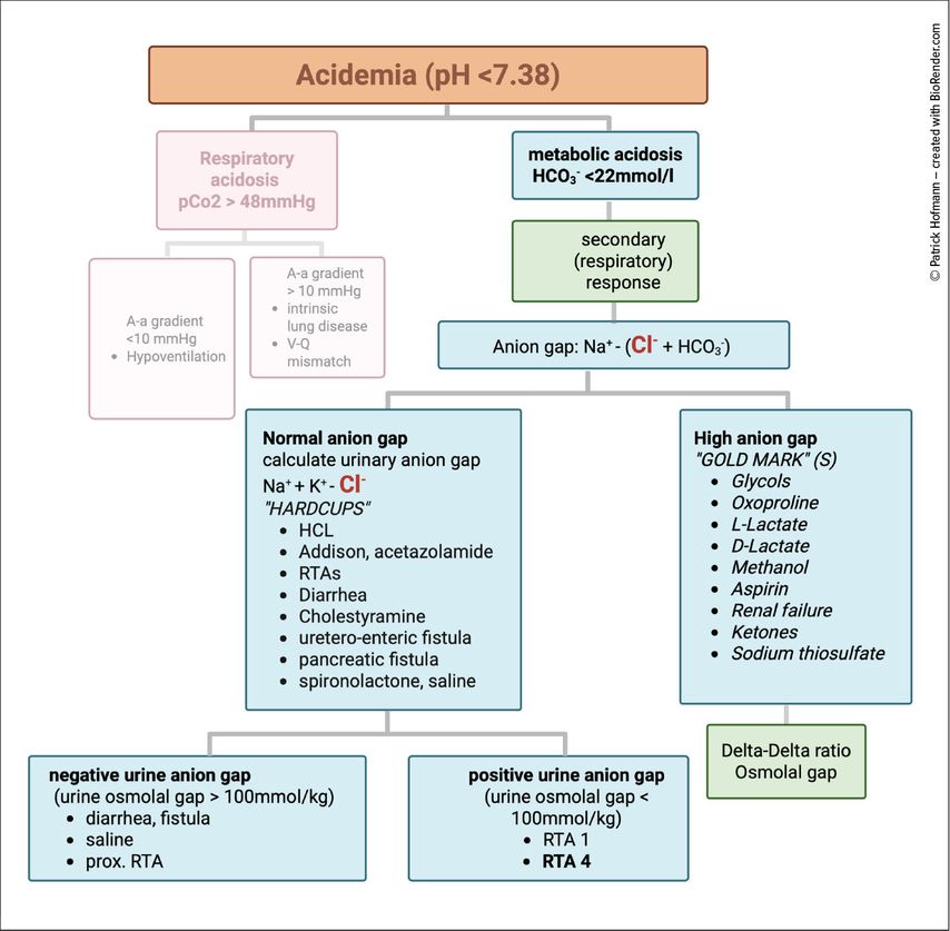 Fig. 3: Assessment of acidosis. Boxes in green are recommended additional steps. Secondary response refers to respiratory compensation of metabolic acidosis. Delta-Delta ratio is used to evaluate for combined acid-base disturbances, such as combined anion gap acidosis with combined normal anion gap acidosis (HAGMA-NAGMA) or HAGMA combined with metabolic alkalosis. An elevated osmolal gap in patients with HAGMA points towards toxic alcohol ingestion (created with BioRender.com)