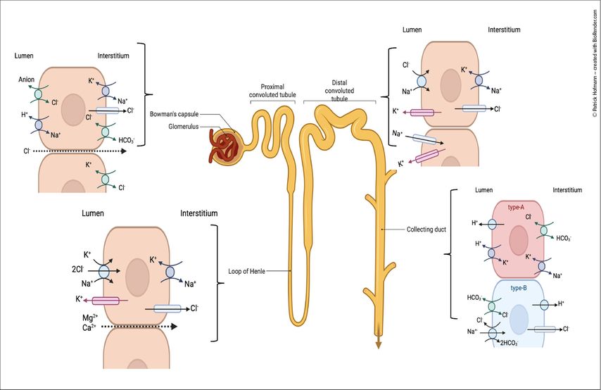 Approximately 99% of filtered chloride is reabsorbed along the nephron through segment-specific mechanisms. In the proximal tubule, chloride uptake occurs predominantly via paracellular pathways, supported by anion exchangers.2 In the thick ascending limb of the loop of Henle, the Na+-K+-2Cl– cotransporter (NKCC2) mediates chloride transport, serving as the target of loop diuretics. In the distal convoluted tubule, fine regulation is accomplished by the Na+-Cl– cotransporter (NCC), the site of action for thiazide diuretics.
