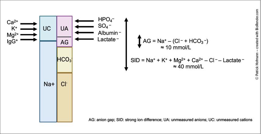 Fig. 1: “GambleGram” depiction of blood serum electrolytes. The total anion and total cation concentrations must be equal to maintain electroneutrality. The differences between these groups form the basis for calculating the anion gap (AG) and the strong ion difference (SID) (created with BioRender.com)