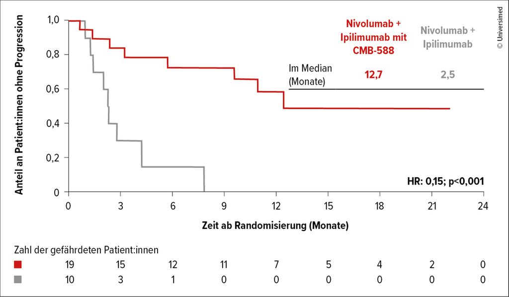 Im dritten Teil ihres Vortrags widmete sich Schmidinger Themen, die vermutlich in den kommenden Jahren noch mehr Aufmerksamkeit gewinnen werden. Eines davon war die bakterielle Manipulation des Mikrobioms: So gibt es bereits Evidenz dafür, dass die Zugabe des bakteriellen Produkts CBM-588 zur IO19 bzw. zu IO + TKI20 auf signifikante Weise das PFS und die Responseraten beeinflusst: Bei der Gabe von Nivo + IPI + CBM-588 war das mediane PFS mit 12,7 Monaten vs. 2,5 Monate signifikant länger (HR: 0,15; p=0,001) als ohne CBM-588 (Abb. 2). Die ORR war, wenn auch nicht statistisch signifikant, mehr als doppelt so hoch (5% vs. 20%; p=0,06).19
