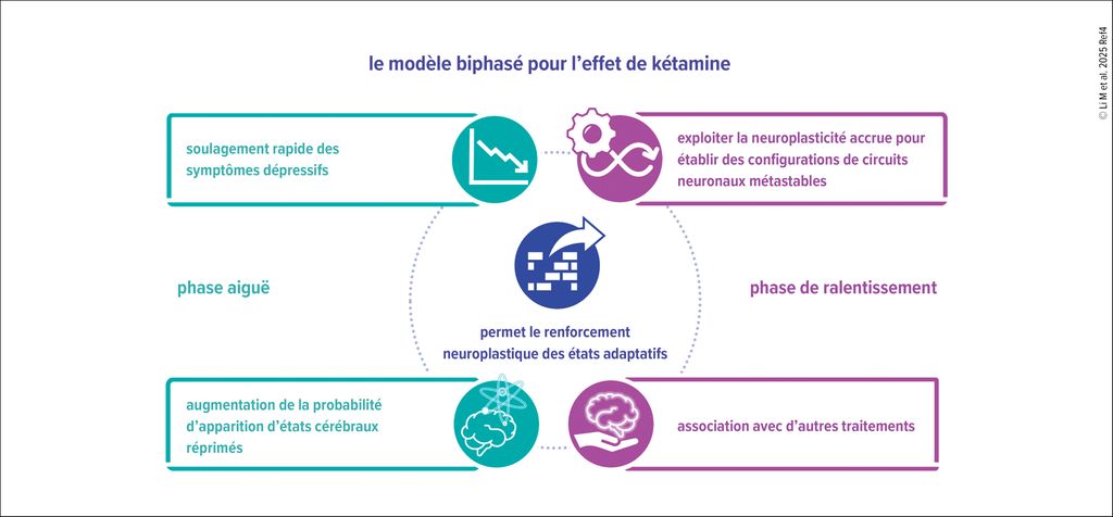 Fig. 1: Le modèle d’action biphasique permet d’expliquer à la fois les effets positifs aigus et persistants dans le traitement de la dépression résistante aux traitements (Li M et al. 2025)4