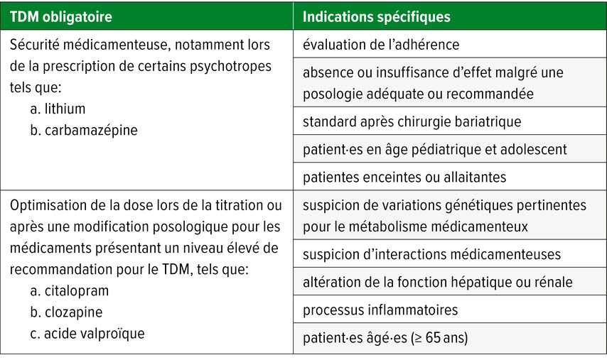 Sur la base de la ligne directrice consensuelle actuelle relative au suivi thérapeutique des médicaments en neuropsychopharmacologie, on distingue un TDM obligatoire et des indications spécifiques à son utilisation.4 Le TDM est considéré comme obligatoire pour le traitement d’un nombre restreint de psychotropes, tels que le lithium ou la carbamazépine, qui présentent une marge thérapeutique étroite. Le TDM est également obligatoire pour l’optimisation posologique lors de la titration ou après une modification de dose pour les médicaments disposant de preuves solides quant à la pertinence du TDM ou d’un niveau élevé de recommandation en faveur du TDM. Dans le cadre d’indications spécifiques, le recours au TDM permet de répondre à de nombreuses questions cliniques, telles que la prévention des rechutes en cas de prise médicamenteuse incertaine ou l’optimisation de la psychopharmacothérapie chez les patientes enceintes ou allaitantes. Le tableau 1 donne un aperçu des principales situations cliniques concernées.