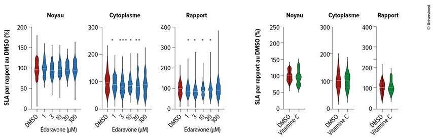 Chez une patiente porteuse d’une mutation A382T du gène TARDBP, le traitement a également entraîné pendant 24 heures une préservation dose-dépendante de la structure et de la longueur des neurites dans les cellules de la SLA, ainsi qu’une réduction concomitante de la neurodégénérescence. Il est intéressant de noter que cet effet n’a pas été observé avec l’antioxydant hydrosoluble vitamine C. Les auteur·rices estiment donc que l’édaravone a des effets supplémentaires sur les cellules et prévient ainsi la neurodégénérescence.