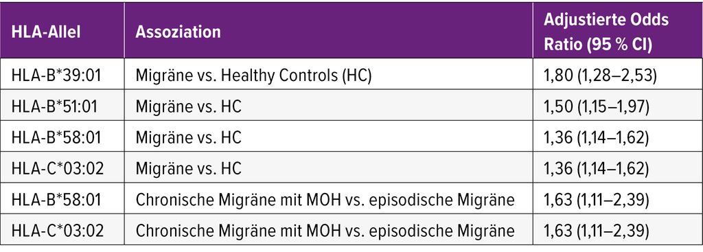 Anhand von genomweiten Vergleichsstudien (GWAS) mit 2125 Patient:innen und 1659 gesunden Proband:innen aus Taiwan konnten Chen und Kolleg:innen belegen, dass es sich bei LRP1 und TRPM8 um ethnizitätsunabhängige Risikoloci für Migräneanfälligkeit handelt. Konkret ist das rs1172113 in LRP1 mit einer OR von 1,23 (95%CI: 1,04–1,45) für eine Migräneanfälligkeit assoziiert. Menschen mit rs10166942 in TRPM8 weisen eine entsprechende OR von 1,33 (95%CI: 1,14–1,54) auf.4 Huang et al. zeigten, dass Allele des „human leukocyte antigen-B and -C“ (HLA-B/C) mit einer klinischen Migränediagnose und einer Chronifizierung der Migräne mit Medikamentenübergebrauchskopfschmerz assoziiert sind (Tab. 1). Somit könnten diese Allele wertvolle diagnostische und prognostische Biomarker darstellen.5