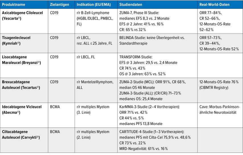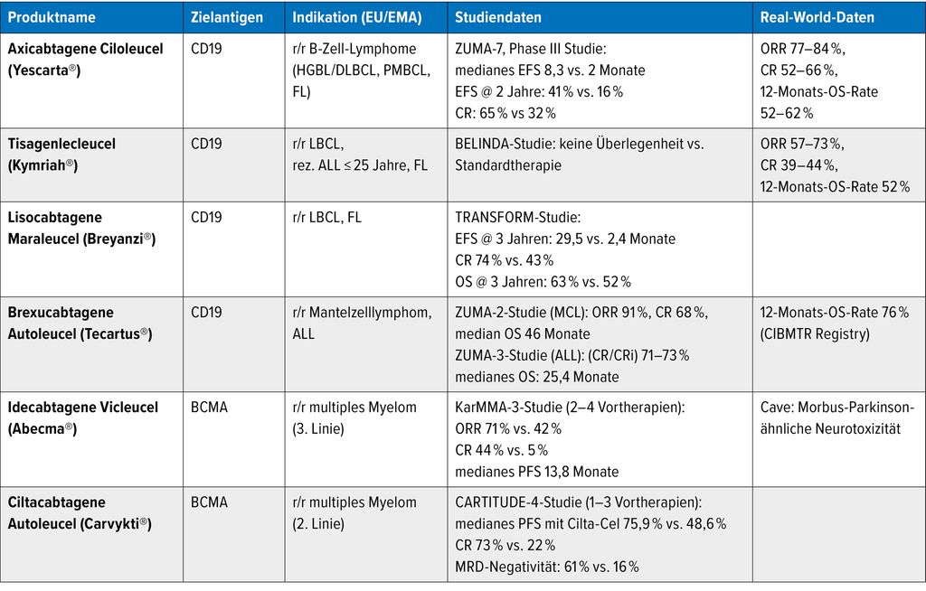 Alle kommerziell erhältlichen CAR-T-Zellen sind „Zweitgenerationskonstrukte“ und bestehen aus einer extrazellulären Antigenbindedomäne (meist scFv), einer Transmembrandomäne, einer intrazellulären Signaldomäne (CD3 zeta) und einer kostimulatorischen Domäne (CD28 oder 4-1BB). Derzeit sind sechs kommerzielle CAR-T-Zell-Produkte verfügbar, gegen zwei Antigene (CD19, BCMA; Tab.1).