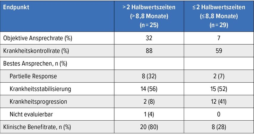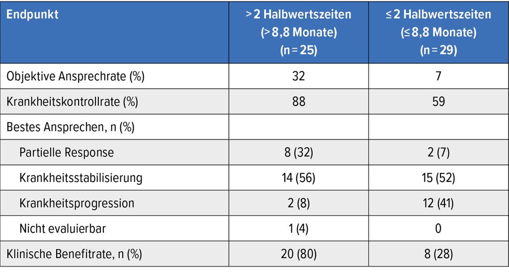 Tab. 2: Ansprechen auf Amivantamab nach mCRC-Progression in Abhängigkeit vom therapiefreien Intervall (Halbwertszeiten für den mutativen Zerfall) (modifiziert nach Arnold D et al.)8