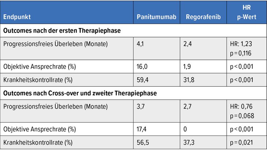 Weitere Einschlusskriterien umfassten unter anderem mindestens eine Anti-EGFR-freie Folgetherapie und ein Intervall von ≥4 Monaten zwischen dem Ende der EGFR-gezielten Behandlung und dem Screening. Randomisiert wurde entweder Panitumumab oder Regorafenib bis zur ersten Progression verabreicht. Danach erhielten die Patient:innen das jeweils andere Medikament bis zur zweiten Progression.