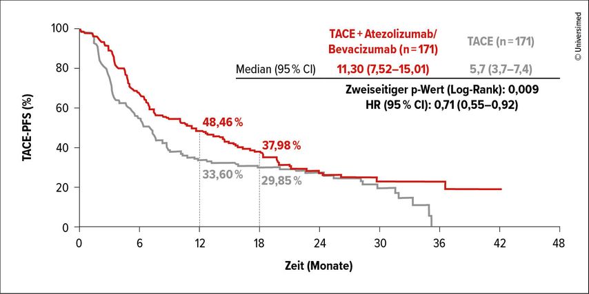 Abb. 1: Verlängerung des TACE-PFS unter TACE+Atezolizumab/Bevacizumab vs. alleinige TACE beim hepatozellulären Karzinom (modifiziert nach Dong J et al.)2