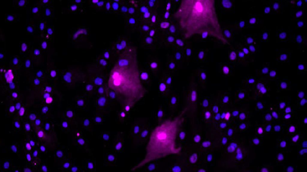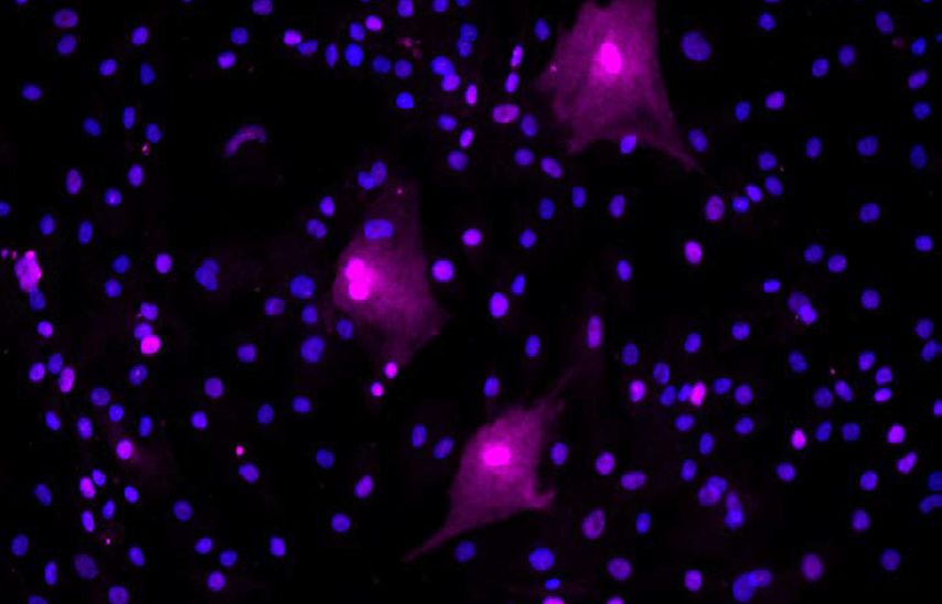 Abb. 1: Seneszente synoviale Fibroblasten aus menschlicher arthrotischer Synovia. Die Fibroblasten wurden mit einem Antikörper gegen p16 immungefärbt, um seneszente Zellen zu detektieren. Diese erscheinen hier in der Immunfluoreszenz pink. Mit DAPI wurden die Zellkerne gefärbt, die sich blau darstellen. Die pinken, seneszenten Zellen zeigen das typische „Spiegelei“-Aussehen. Das Foto wurde zur Verfügung gestellt vom Labor von R. Loeser, Thurston Arthritis Research Center, The University of North Carolina