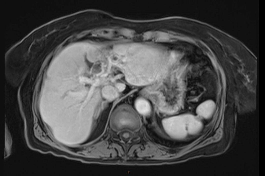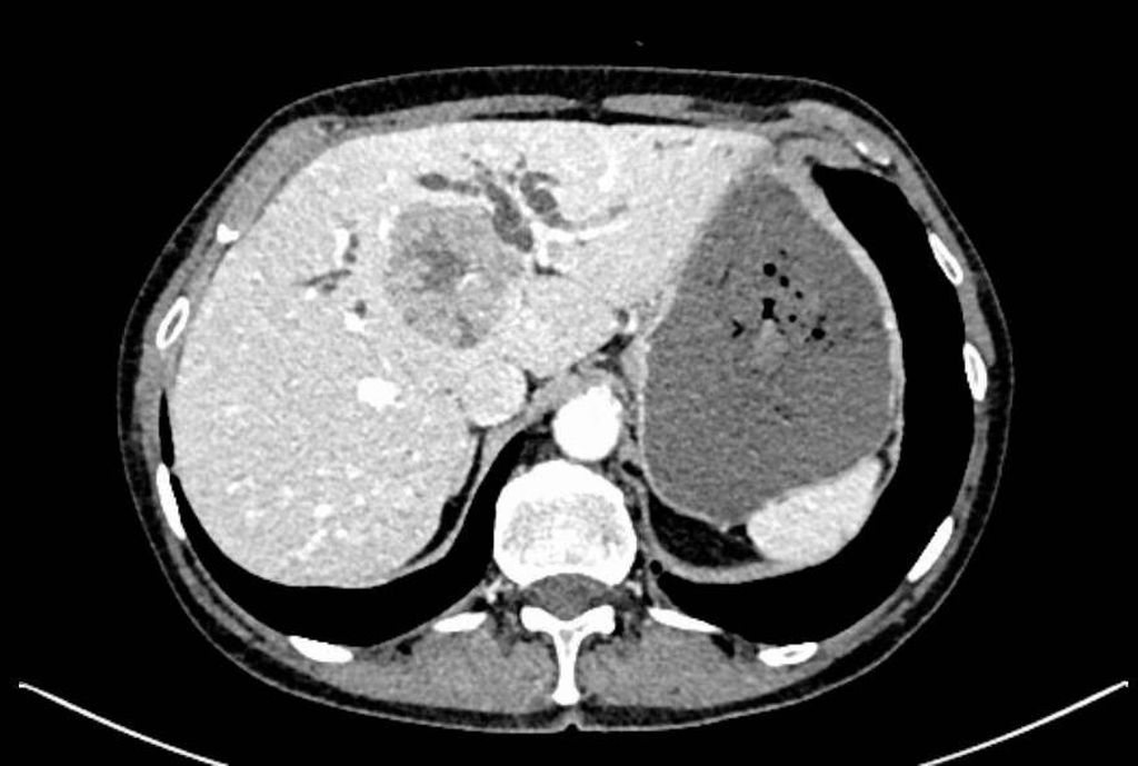 Die initiale CT zeigte eine bis zu 6cm große Raumforderung, ausgehend von der Hepatikusgabel, mit zentraler Infiltration des Leberparenchyms, suspekten Lymphknoten im Leberhilus und retroperitoneal, deutlich dilatierten intrahepatischen Gallengängen sowie Umscheidung und Infiltration des linken Pfortaderastes, jedoch ohne Thrombose. Der Befund war hochverdächtig auf einen cholangiozellulären Tumor. Die histologische Aufarbeitung einer Punktionsbiopsie ergab jedoch ein gering differenziertes, hiläres hepatozelluläres Karzinom (WHO 2019: G3). Angesichts des bildgebenden Befundes und des ebenfalls erhöhten Ca19-9 stand der Verdacht auf einen Mischtumor im Raum.