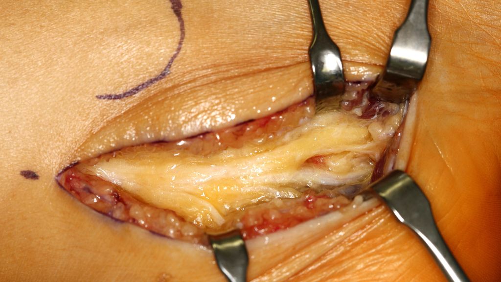 Bei Versagen der konservativen Therapie, Nachweis einer relevanten Raumforderung in der Bildgebung und positiver elektrophysiologischer Diagnostik ist die chirurgische Therapie indiziert. Es stehen hierbei offene Verfahren und minimal invasive Techniken zur Verfügung. Das Standardverfahren ist die offene Dekompression des Tarsaltunnels mit Darstellung des Nerven inklusive seiner drei Äste, Resektion der Raumforderung, Release des Retinaculum flexorum und Spaltung der tiefen Faszie des M. abductor hallucis (Abb.2).