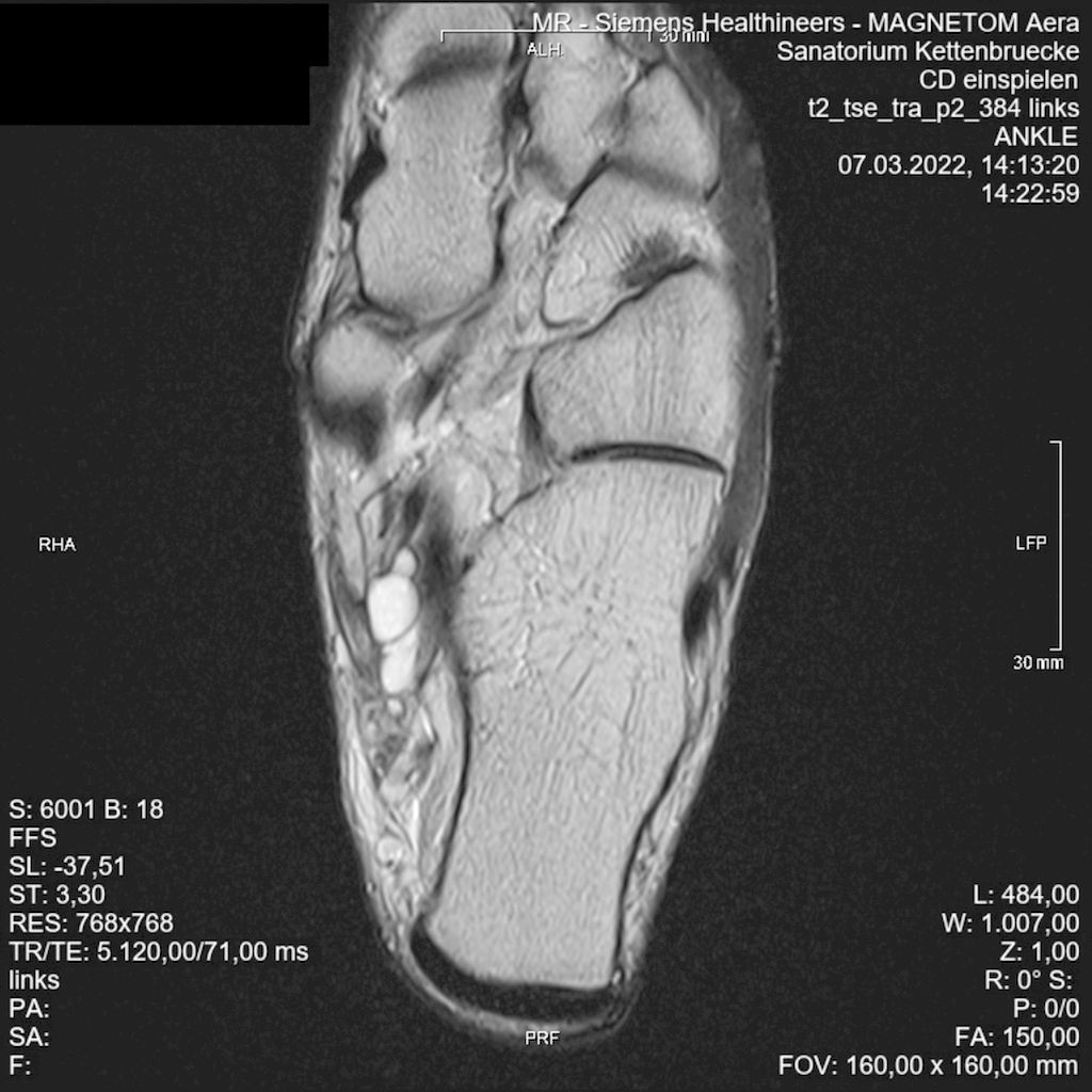 Die Röntgenaufnahme des Sprunggelenks im Stehen in zwei Ebenen ist der Standard zur Beurteilung von Fehlstellungen, Frakturen und eventuell vorliegenden knöchernen Raumforderungen im Bereich des Tarsaltunnels. Die Sonografie ist eine günstige und breit verfügbare Untersuchungstechnik. Mit ihr lassen sich direkte Zeichen der Nervenkompression mit fokaler Vergrößerung der Faszikel und Änderungen der Echogenität gut darstellen.5 Die Magnetresonanztomografie ist der Goldstandard in der weiterführenden Schnittbildgebung zur Beurteilung vorliegender Raumforderungen mit Bedrängung des Nervus tibialis (Abb.1).