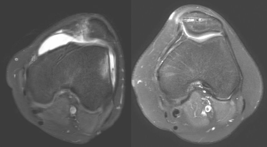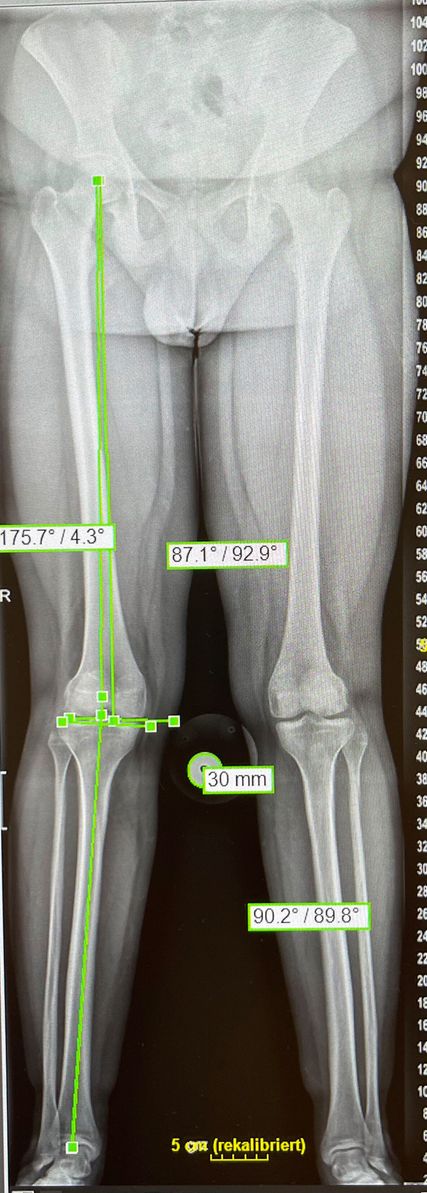 Standardmäßig werden an unserer Abteilung ein Röntgen des Kniegelenks in zwei Ebenen, ein Beinachsenröntgen und eine MRT-Untersuchung durchgeführt. Bei klinischem Verdacht auf eine vermehrte Innenrotation des Femurs wird ein Rotations-MRT ergänzt.4