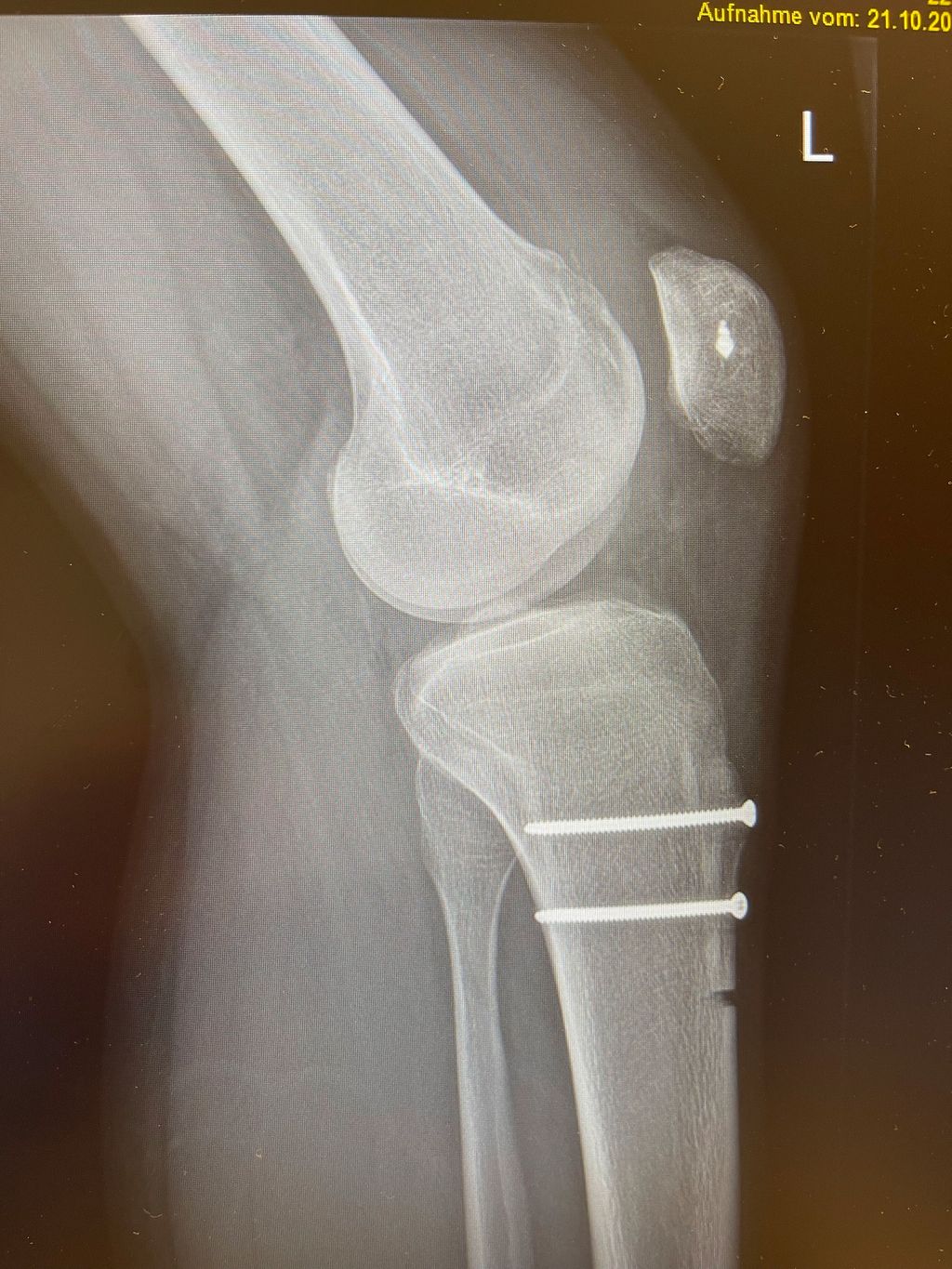 Bei der Patella alta wird der Ansatz knöchern etwas nach distal versetzt. Die Schnittführung ist lateral parallel zur Tuberositas, die Osteotomie erfolgt tangential unter Schonung der Patellasehne. Als Führung können 2 Kirschnerdrähte parallel entlang der Schnittführung eingebracht werden. Vor der Operation wird als Anhaltspunkt die gewünschte Distalisierung errechnet. Es empfiehlt sich jedoch, intraoperativ den Patellastand mittels Bildwandler zu kontrollieren (Ziel ist ein Caton-Deschamp-Index unter 1). Die endgültige Fixierung erfolgt mit zwei 3,5-mm-Schrauben (Abb. 9).8
