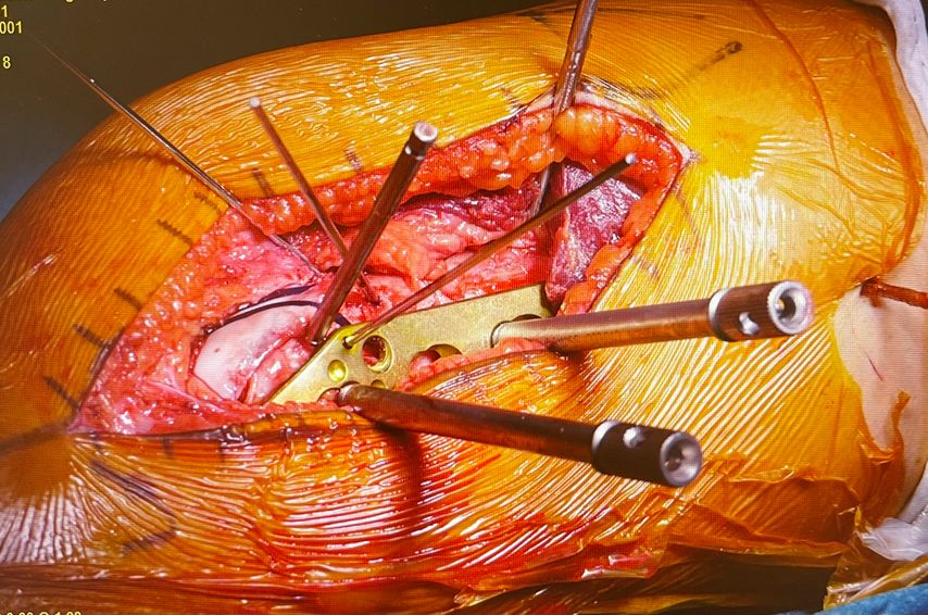 Wie bereits erwähnt, wird eine Derotation des Femurs ab einer vermehrten Innentorsion von ca. 35° empfohlen. OP-Zugang ist ein distaler lateraler Femurzugang. Wir empfehlen eine biplanare Schnittführung, um ungewünschte Achsabweichungen zu vermeiden. Wichtig ist, vor der Osteotomie die gewünschte Korrektur mittels Kirschnerdrähten zu markieren (Abb. 10). Die Osteotomie muss im Unterschied zur Achskorrektur komplett durchgeführt werden, um das Verdrehen des Oberschenkelknochens zu ermöglichen. Zum Schutz der Arterie empfiehlt es sich, einen röntgendurchlässigen Hohmann zu benützen. Nach der Korrektur erfolgt die Fixierung mittels winkelstabiler Platte (Abb. 11).