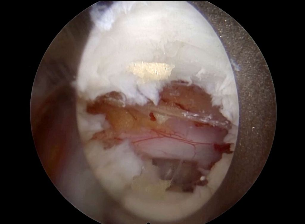 Abb. 2: Darstellung der Nervenwurzel nach Resektion der Diskushernie durch einen monoportalen interlaminären Zugang