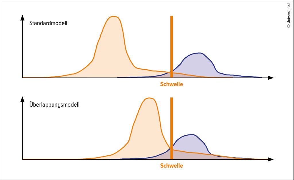 Abb. 2: Die Grafik zeigt oben das sogenannte Standardmodell, das von einer theoretischen Verteilung aus gesunder Bevölkerung und Patienten mit eindeutigen FAI-Zeichen ausgeht. Die Schwelle zeigt einen sehr geringen Anteil an sich überlappenden Kurvenanteilen und geht von eindeutigen Tests und Untersuchungsergebnissen aus, die eine Differenzierung erlauben. Die untere Grafik zeigt das sogenannte Überlappungsmodell, das hingegen davon ausgeht, dass ein grosser Anteil beider Gruppen eine Überschneidung (falsch-positive oder falsch-negative Befunde) zeigt, was in der Folge bedeutet, dass es keine eindeutigen Tests zu geben scheint, die eine klare Differenzierung zulassen (mod. nach Sutter und Pfirrmann 2017)8