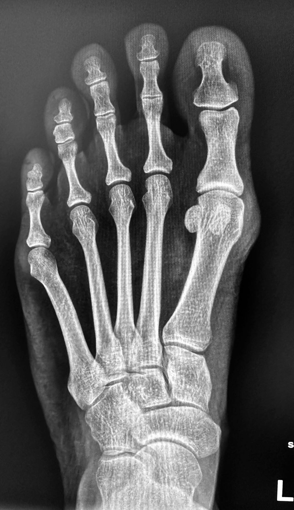 Eine 47-jährige Patientin kommt wegen Beschwerden im Bereich des Vorfußes zur Begutachtung. In der Anamnese wird über Beschwerden bei Belastung berichtet, wobei hier die Beschwerdesymptomatik hauptsächlich medialseits am Kopf des Metatarsale I angeführt wird, zusätzlich würden jedoch auch Schmerzen plantarseits im Bereich des gesamten Fußballens auftreten. Diese werden jedoch nicht bei Belastung, sondern vor allem in Ruhe wahrgenommen.