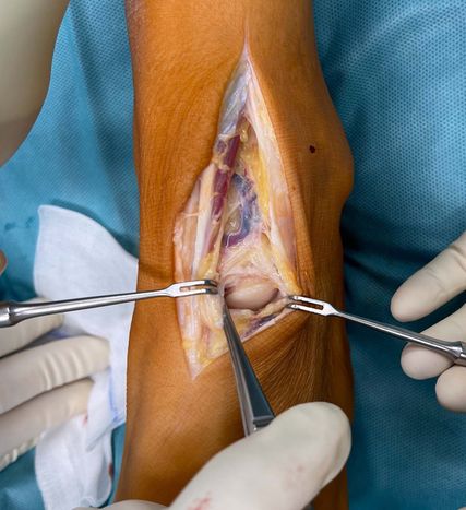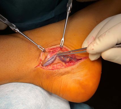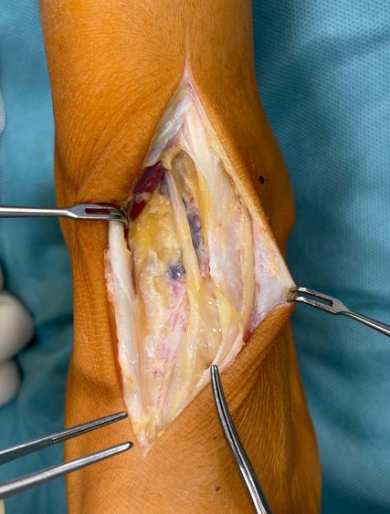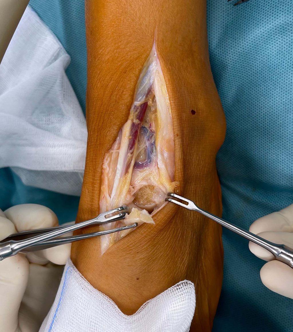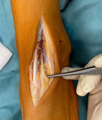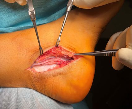 Der intraoperative Befund bietet eine doch deutliche Abflachung des Nervus tibialis in dem Bereich, wo die Arteria tibialis posterior Richtung plantar den Nerv kreuzt (Abb. 2). Aus diesem Grund wird hier auch immer ein Mucosapatch zwischen Arterie und Nerv eingebracht (Abb. 3). Im Bereich des Nervus peroneus profundus (Abb. 4) zeigt ein relativ instabiles TN-Gelenk eine doch deutliche knöcherne Auftreibung (Abb. 5), die bei Plantarflexion auch die Ursache für die Nervenkompression sein muss. Aus diesem Grund wird der überstehende Knochen abgemeißelt (Abb. 6 und 7).