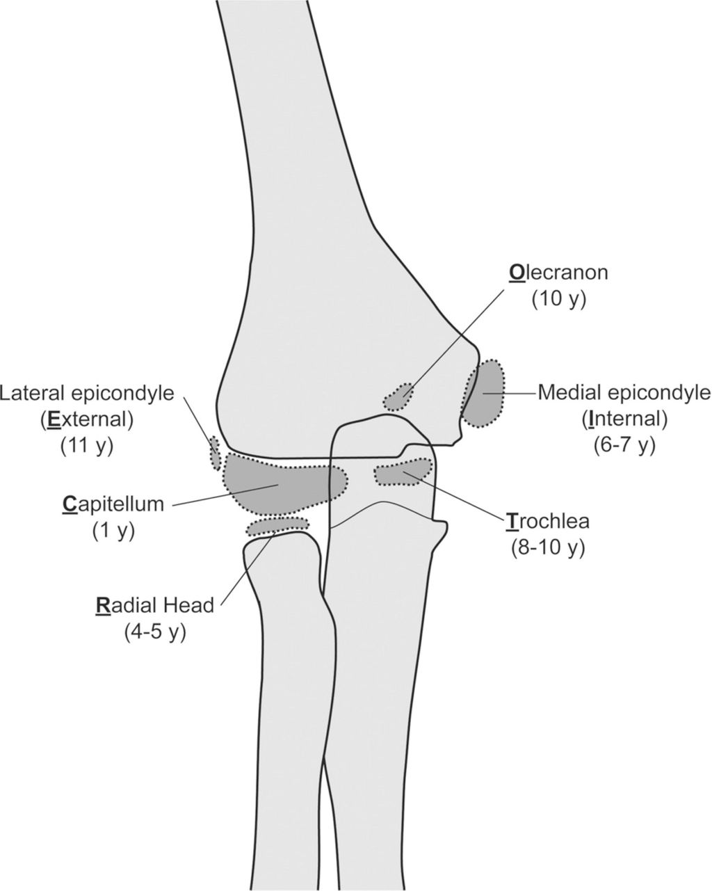 Der Ellbogen des Jugendlichen stellt weiterhin spezifische Herausforderungen im klinischen Alltag dar. Die Interpretation des einfachen Röntgens wird durch die multiplen Knochenkerne erschwert. Zum Glück treten diese in verhältnismässig geordneter Reihenfolge jährlich entsprechend dem Merkwort CRITOE (Capitellum – Radiuskopf – innerer (medialer) Epicondylus – Trochlea – Olekranon – externer [lateraler] Epicondylus) entsprechend den ungeraden Zahlen 1–11 auf. (Abb. 2). Sie verschmelzen mit dem Humerus zwischen dem 12. und 16. Lebensjahr, wobei Capitellum, Trochlea und lateraler Epicondylus gleichzeitig fusionieren, gefolgt von Radius, Olekranon und zuletzt medialer Epicondylus. Das heisst, wenn der Knochenkern des Olekranon sichtbar ist, der mediale Epicondylus aber nicht, dann handelt es sich mit hoher Wahrscheinlichkeit um eine dislozierte Fraktur und der oder die Patient:in hat ein (Knochen-)Alter von ungefähr 9 Jahren. Sieht man eine Aufhellung am medialen Epicondylus, aber die Wachstumsfuge des lateralen Epicondylus ist auch zu sehen, so liegt mit hoher Wahrscheinlichkeit keine Fraktur vor.