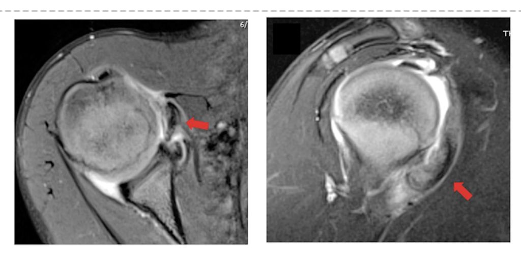Gerade im Wachstumsalter ist die Schultergelenkskapsel die primär vulnerable Struktur in der Schulterstabilität. In vielen Fällen ist dies ein angeborenes Problem, bis 14 Jahre ist aber auch die Kapselruptur die pathognomische Verletzung der Schulterluxation. Die Problematik wird oft übersehen, da die Kapsel am MRI kaum abgrenzbar ist (Abb. 4). Glücklicherweise kann die Gelenkkapsel sehr stabil und schnell vernarben, sollte es aber zu anhaltenden Instabilitäten und damit zur Operationsindikation kommen, so sollte die Kapselverletzung entsprechend behandelt werden.
