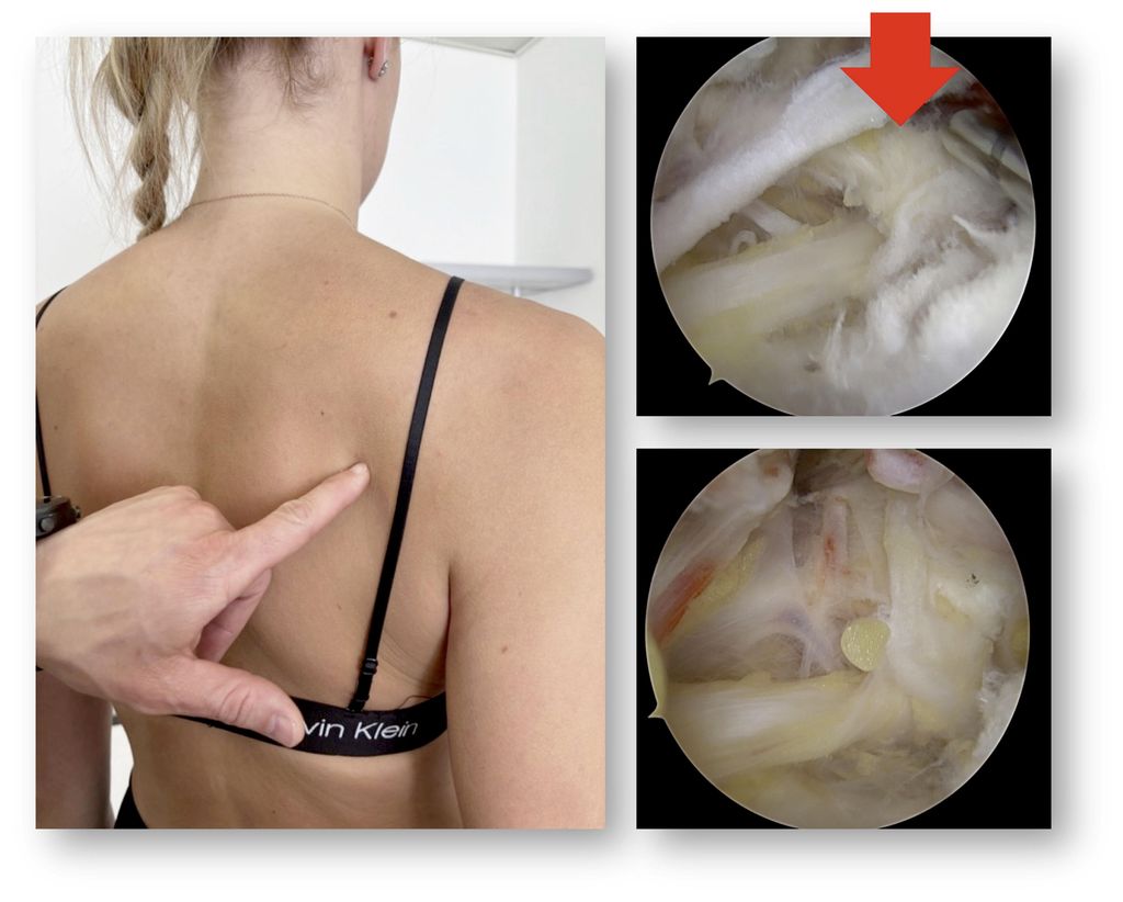 Abb. 7: Die Kompression des N. suprascapularis zeigt eine Atrophie des Infraspinatus, das Ligament über dem Nerv (roter Pfeil) wird zur Dekompression durchtrennt