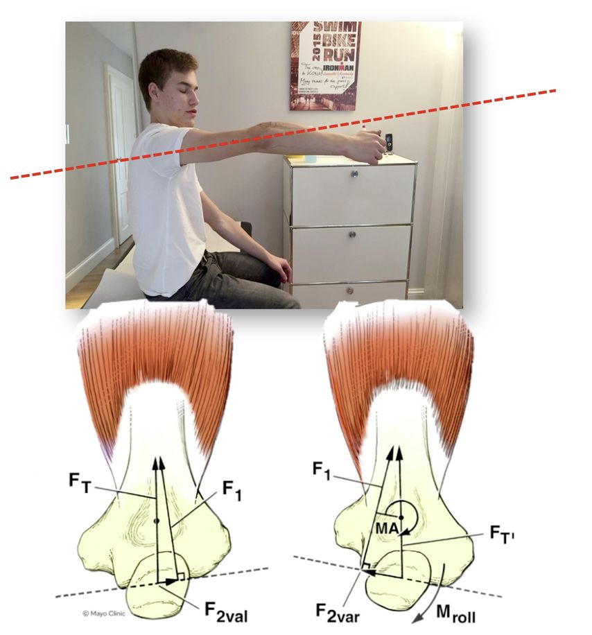 Abb. 9: In der varisch verheilten distalen Humerusfraktur, der sog. gunstock deformity, kommt es zu einer Verschiebung des Kraftvektors des Trizeps mit einem neuen Drehmoment, das die (postero)lateralen Strukturen des Ellbogens belastet. Nach: O‘Driscol SW; JSES Int. doi: 10.1016/j.jseint.2023.03.017