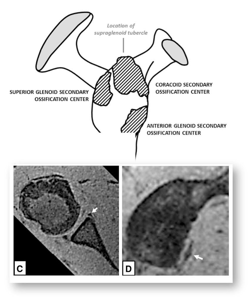 Das Glenoid ossifiziert erst im Alter von 11–12 bzw. 11–17 Jahren (Mädchen/Jungen︎), es besteht daher die Gefahr eines falsch positiven MRI. Labrumläsionen sind trotzdem nicht ausgeschlossen, es zeigt sich im Kindesalter aber eine höhere Inzidenz von begleitenden Kapselverletzungen als bei Erwachsenen. Bei der Behandlung ist es dementsprechend wichtig, beide Probleme gleichermassen zu suchen, ein-/auszuschliessen und zu adressieren.