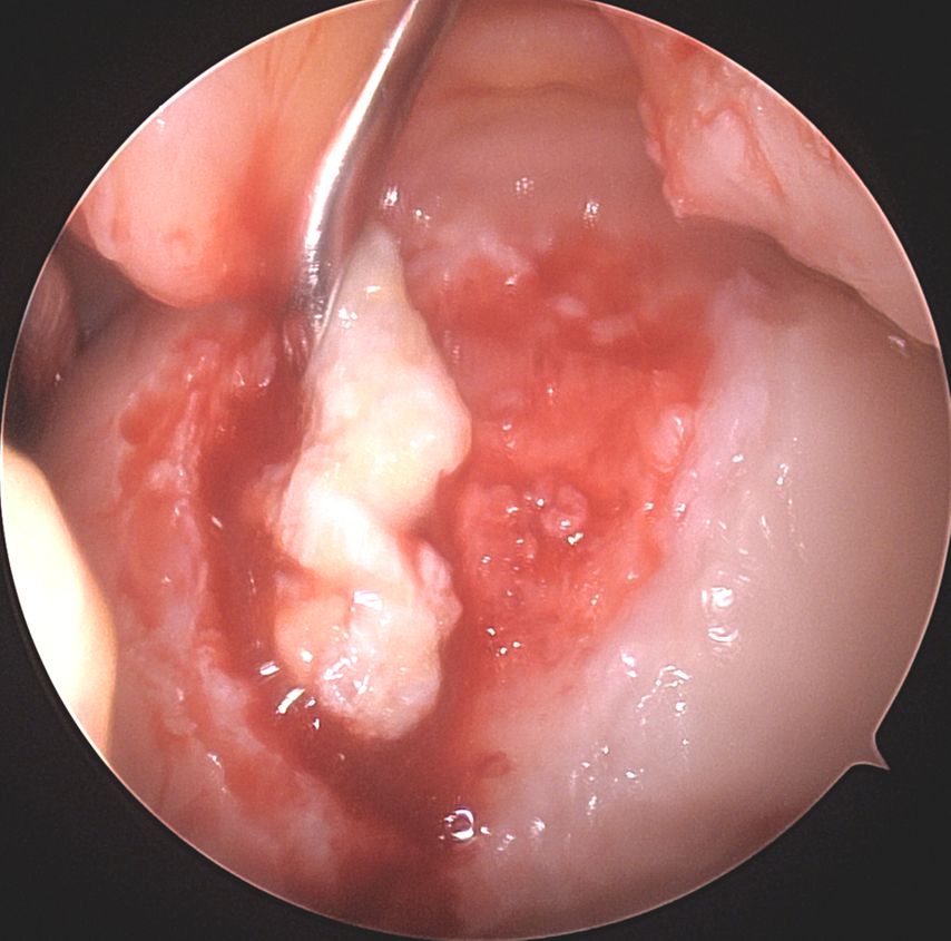 Abb. 1d: Intraoperative, rein arthroskopische Trokar-Applikation der autologen Knorpelfragmente in den Defekt an der medialen Femurkondyle vermischt mit PRP im Rahmen der Minced-Cartilage-Prozedur