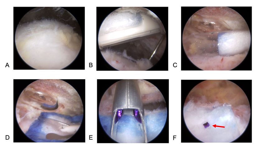 Abb. 1: Arthroskopische Bilder einer Patientin (45a) mit bursaseitiger Partialruptur der Supraspinatussehne und Substanzdefekt (A). Die Kanüle (B, C) mit dem Kollagen-Patch wird über ein laterales Arbeitsportal eingebracht und temporär fixiert (D). Der Patch wird nun auf den Defekt gelegt und über einen Inserter (E) mit Clips (roter Pfeil) fixiert (F)