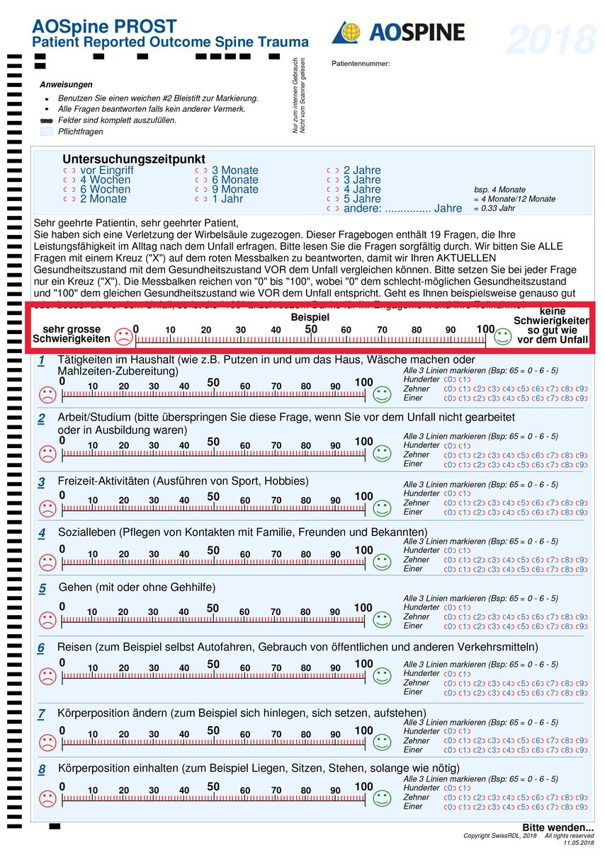Originalfragebogen entwickelt 2017 vom AO Spine Knowledge Forum Trauma (validiert auf Niederländisch)
